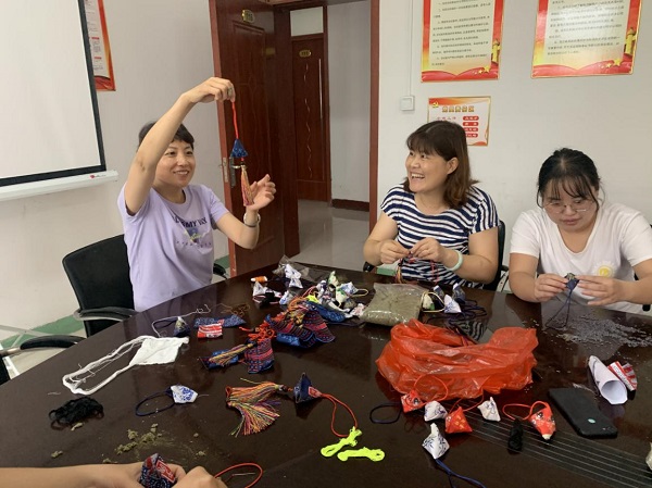 在传统习俗中,玲珑可爱的各色香包也是端午节必不可少的元素。包完粽子后大家转移阵地到了活动室,大家围坐桌边,面前堆放着一份份材料包,有棉布、艾草、针线、中国结流苏。面对这个从来没有做过的DIY,大家开始研究起来,有的用手机搜索缝制方法流程,有的直接比来比去亲自摸索着缝起来。有职工说:“这有点像咱们小时候老人们缝的毽子,那个里面装的是五谷杂粮,咱们现在装的是艾草。”“这香囊可以挂在办公室或者车上,有清香、驱蚊的功效。”“我算是知道了,这个流苏应该缝在这个边的中间,而不是角上……”大家你一句我一句,手中的针线穿梭在棉布间,用密密的针脚缝制出传统佳节最好的注解,用丝丝线线缠绕出端午安康的美满寓意,一个个精巧可爱的三角香囊在大家的努力下完美呈现。