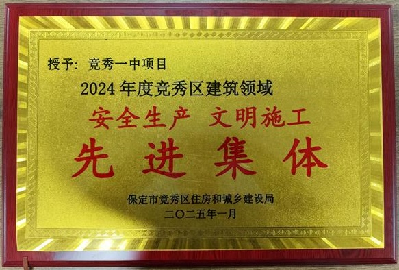 2025年1月14日,在保定市竞秀区住房和城乡建设局举办的2024年度总结表彰大会上,六分公司竞秀一中项目部被授予“安全生产文明施工先进集体”荣誉称号。