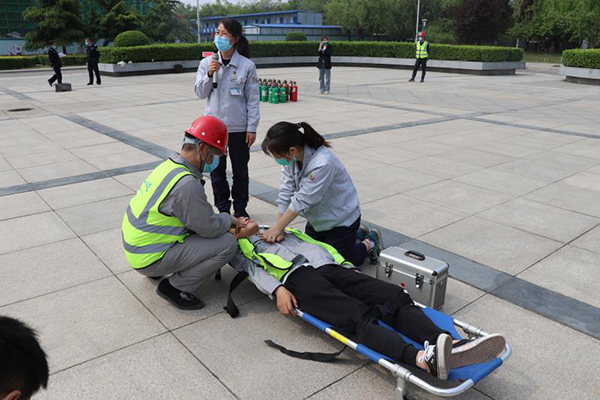 上午10点,消防救援支队讲解员对全体人员进行消防安全知识培训,详细讲解了防烟面罩正确佩戴方法、疏散逃生要领,以及灭火器的使用方法和注意事项。10点半左右,演练正式开始,施工现场三区二层浓烟滚滚,“着火了,着火了¨¨¨”项目安全员在现场巡查时发现火情高声呼喊,周围施工人员迅速拿灭火器进行灭火,项目经理张玉宾接到险情后马上通知义务消防队员灭火并组织紧急疏散。大家用湿毛巾捂住口鼻,俯身低头按照演练逃生路线快速从现场撤离到演练集合区。在大家撤离火灾现场的同时,救援组孙杰、杨克、董拥军等人把伤员抬到通风处,他们在医疗救护组的指导下,用双手拍打伤者双肩并呼叫他的名字、用触摸颈动脉等方法断伤者是否丧失意识,并进行心肺复苏。心肺复苏演练时,按压胸部是最有效也是最常用的办法,施救人员首先在伤者两乳头连线中间,胸骨中下三分之一处找准按压点,然后用手掌根部紧贴伤者胸部,两手重叠,五指相扣,手指翘起,肘关节伸直,用上身重量垂直下压30次,经过救治伤者最终苏醒,整个抢救过程有条不紊,最后藁城区消防救援大队长张海宁对应急预案演练进行了点评,此次火灾应急预案演练圆满结束。