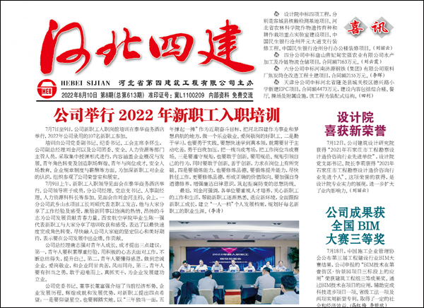 公司党委立足讲好四建故事,传播四建美誉,发力宣传平台建设,做亮业绩宣传、做好典型宣传、做强形象宣传,发挥了最大宣传效能。2022年1-11月份,出版《河北四建》11期,公司网站发稿比去年同期增加166 %;微信公众号发稿期数和条数,比去年同期增加28%和20%;抖音号发布视频数比去年同期增加137.5%。8月份,公司3个平台在中施企协组织的2022年工程建设河北四建河北四建竞赛中均获奖,其中《河北四建》获得报纸类优秀奖、公司网站获网站类优秀奖、公司微信公众号获公众号类优秀奖。(党委宣传部)